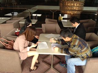 | 台本チェックする会員拡大育成会議の 佐藤議長・小林副議長・三浦君 |