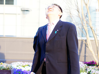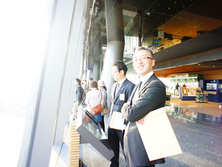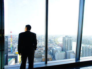 | 20F展望フロアから新潟を一望する平野理事長 | 20F展望フロアから新潟を一望するメンバー | 4F屋外テラスよりメディアシップを見上げる平野理事長 | ||