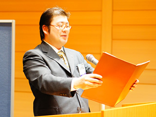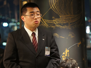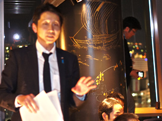 公開委員会〆の挨拶をする古川憲委員長 | 懇親会司会、吉田副委員長 | ||