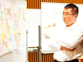 フリータイムで活発に意見交換するメンバー | フリータイムにてキーワードを見る中山元四郎室長 | ||