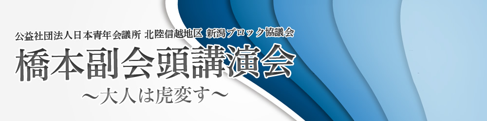 2013年4月27日(土)「ホテルニューオータニ長岡 NCホール」にて、公益社団法人日本青年会議所、橋本副会頭講演会~大人は虎変す~が開催されました。 タイトルの「大人は虎変す」にある「大人」は徳の高い人、「虎変」は虎の毛が美しく生え変わることから、目覚しい変化や変革を表しています。
