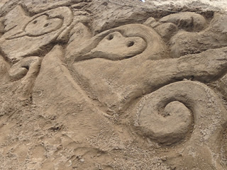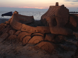 | トキのレリーフ | メイン砂像 | 沈む夕日とメイン砂像 | ||