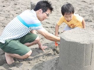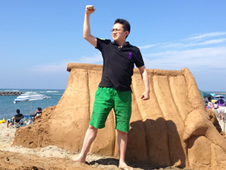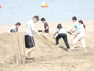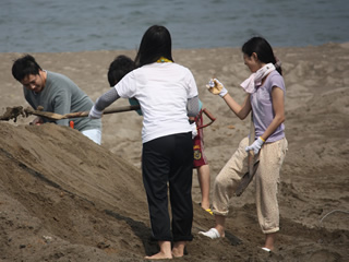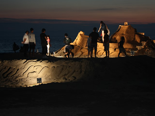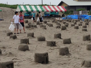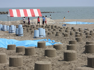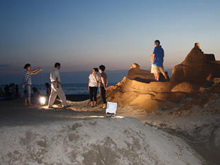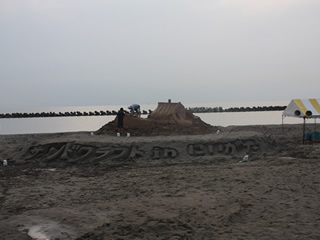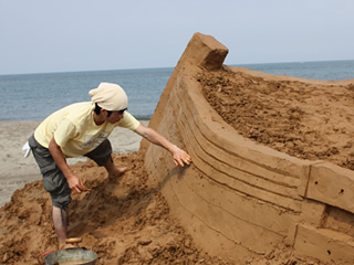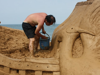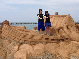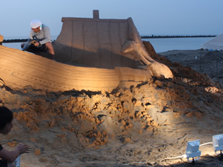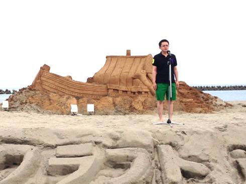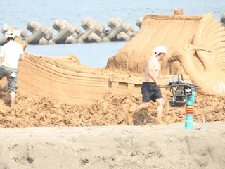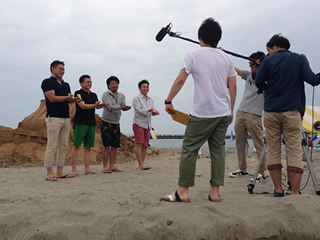 | メイン砂像を補修する井川雅之君 | 平野丸出航?! | テレビ撮影に出演した市民レポーター | ||