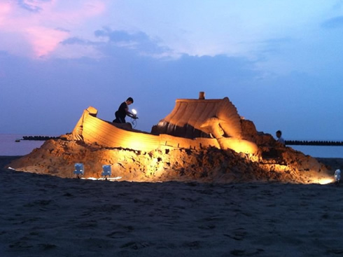 | サンドクラフト理事長挨拶 理事長 平野友孝君 | ライトアップされたメイン砂像 | |