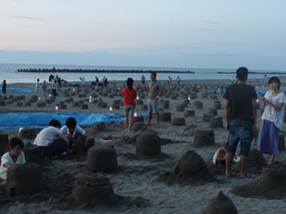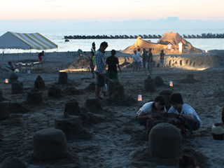 | キャンドルナイト | ライトアップされた砂像と記念撮影をする来場者 | ライトアップされた砂像と記念撮影をする来場者 |