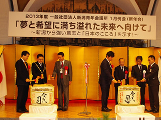 この1月例会(新年会)で親睦・交流を通じ、2013年度平野理事長率いる新潟JCが一丸となって事業を行っていく礎を築きました。本年度も新潟JCは「夢と希望に満ち溢れた未来へ向けて〜新潟から強い意志と「日本のこころ」を示す!〜」のスローガンのもと、新潟のために活動していきます。