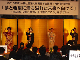 2013年1月11日(金)一般社団法人新潟青年会議所1月例会(新年会)が、ホテルイタリア軒3階サンマルコにて行われました。開会にあたり平野理事長より新年のご挨拶があり、来賓の泉田知事、篠田新潟市長、敦井商工会議所会頭、植木新潟ブロック協議会会長よりご祝辞をいただきました。また、津吉シニアクラブ代表幹事より、乾杯のご発声をいただき、会場は大盛会となりました。会の中盤では、2013年度各委員会の委員長より、本年度事業計画・メンバー紹介・抱負などが発表されました。