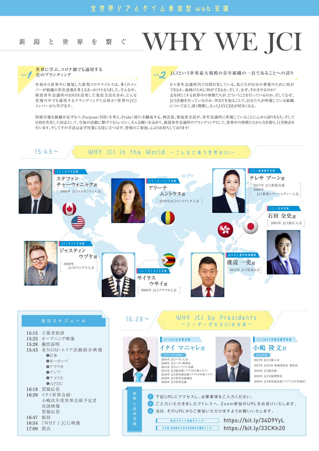新潟と世界中を繋いだオンライン会議となっております。JCI会頭から各国の会頭を含め、たくさんの方々にご参加いただく予定となっております。